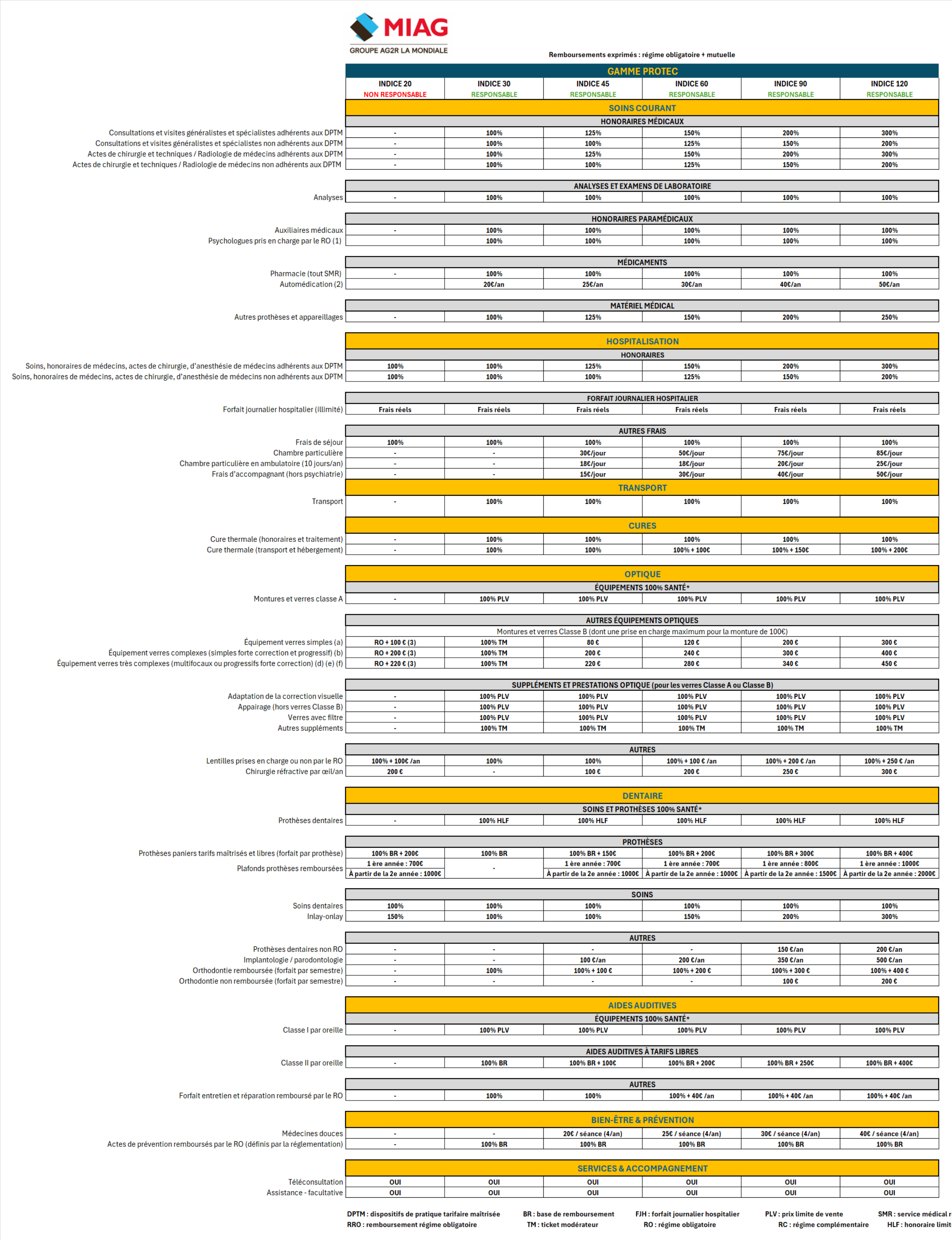 | Garanties / Indices | Indice 20 | Indice 30 | Indice 45 | Indice 60 | Indice 90 | Indice 120 |